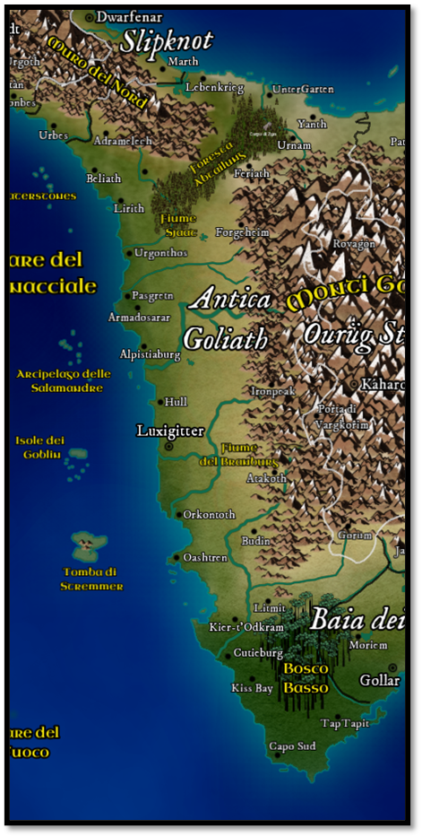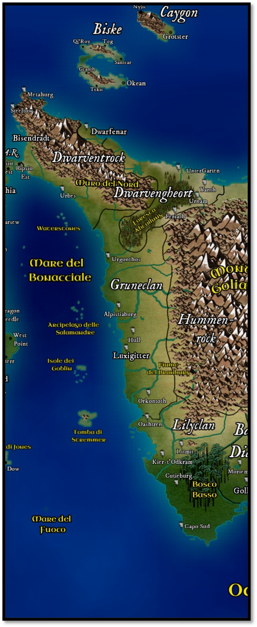I- Dwarventrock: Nel nord si trovare il Clan dei Dwarventrock, che occupava il Dwarventrockerde. Il clan, da sempre aggressivo in politica estera e molto sviluppato tecnologicamente e socialmente, viveva all’interno di grosse montagne nel nordovest del continente, fra le attuali Slipknot e Ruhenstadt. La loro società era sviluppata su cinque livelli: il Capoclan (chiamato Re dei Nani dal suo popolo), gli amministratori, i mercanti e i fabbri, i lavoratori e, infine, gli schiavi. La pratica della schiavitù venne abolita da Under Apstarte, progenitore dell’attuale famiglia regnante di Antica Goliath, nel -112. Questo elemento sarà fondamentale nella storia di Dwarventrock, che di qui in avanti non tollererà più fenomeni di schiavismo: con la benedizione del dio Thoringroth, venne stabilito che il lavoro aveva una sua sacralità ed era un modo come un altro per rendere omaggio al grande dio nano della forgia. Di conseguenza, costringere qualcuno a lavorare in maniera coatta, sostenne Under, non era in alcun modo diverso dal bestemmiare.