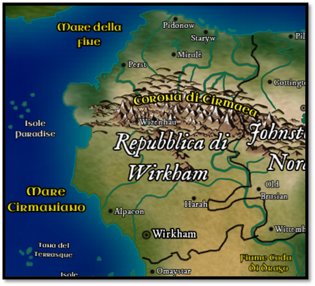 Nell’estremo nord-overst di Cirmaea sorge una repubblica moderna, giovane e ambiziosa, che raramente ha fatto mistero del suo obbiettivo di diventare il principale centro tecnologico di Swirlenheim. La Repubblica di Wirkham è una terra estremamente variegata, che alterna le ricche e belle spiagge di Alpacon alle gelide montagne in mezzo alle quali sorge la città nanica di Harah, il tutto mentre le innovative aeronavi solcano i cieli di Pidonow e una nuova, bizzarra, forma di energia chiamata corrente elettrica imbriglia il furore distruttivo dei fulmini e si appresta, nella prossima decade, a dare forza alle dozzine di industrie della capitale, Wirkham. Ma dietro la patina innovativa e luccicante, pesanti contraddizioni caratterizzano quest’ambiziosa repubblica: il malcelato razzismo generalizzato per la minoranza elfica, la frustrazione di una classe operaia che è pronta a ribollire contro un sistema che non gli riconosce i diritti più basilari. Pur mantenendo una forte stabilità democratica, la Repubblica di Wirkham soffre di forti divisioni e di una costante lotta di classe che sembra, sempre più, vedere spuntare i grandi capitani d’industria. C’è inoltre da considerare le spaccature etniche, la non sempre facile convivenza fra razze che solitamente non vanno d’accordo fra di loro e, forse ancora più importante, il forte senso di appartenenza territoriale dei Wirkhamiani. All’infuori dei cittadini della capitale e in parte di Pidonow, difatti, qualsiasi cittadino di questa nazione si sentirà maggiormente legato al suo villaggio che non alla sua madrepatria: con villaggio, a Wirkham, non bisognerà mai immaginarsi piccoli paesi da qualche migliaio di abitanti ma bensì gigantesche regioni con l’autonomia tipica di un piccolo stato, in cui di tanto in tanto nascono fazioni indipendentiste solitamente innocue ma talvolta violente, in grado di creare un vero e proprio problema di terrorismo.